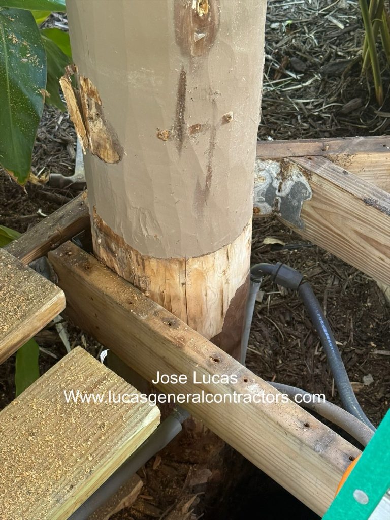 Here are photos of a rotten cypress post on a tiki hut – another company installed and we are replacing