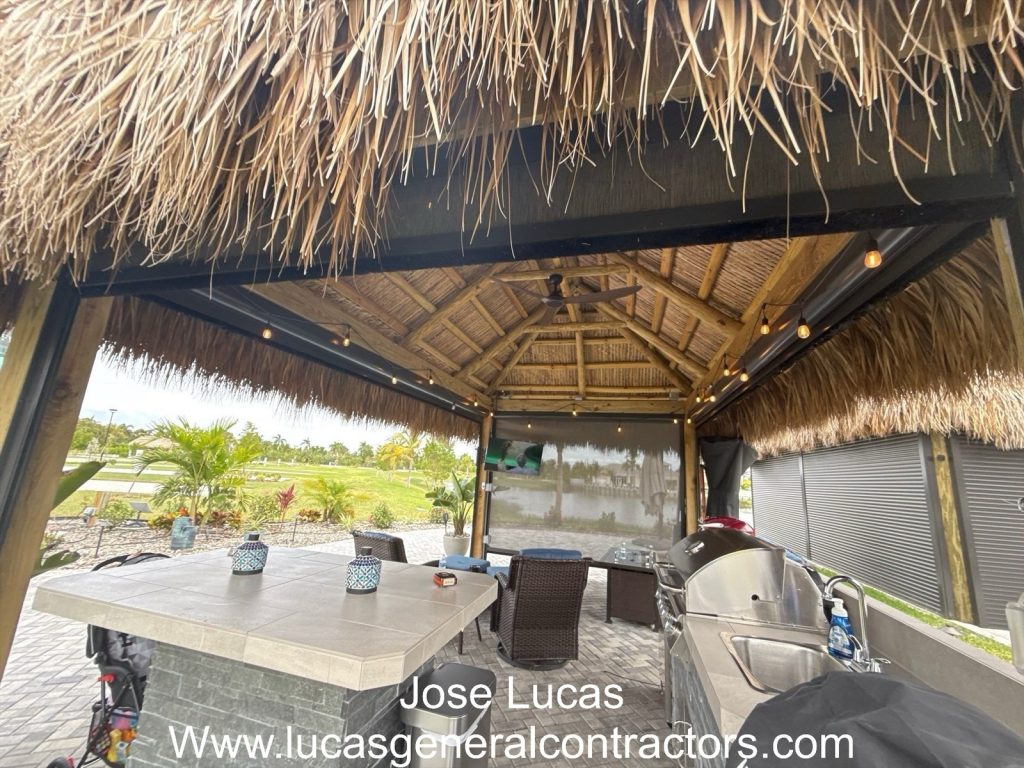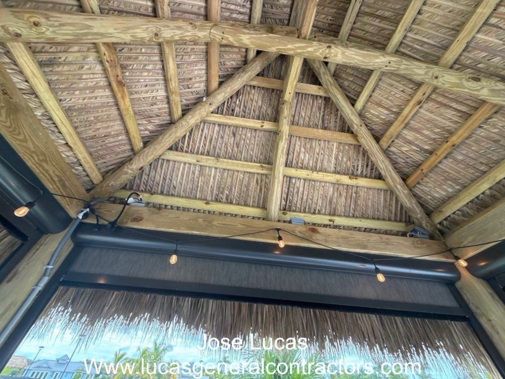 Tiki hut with rolldowns shades